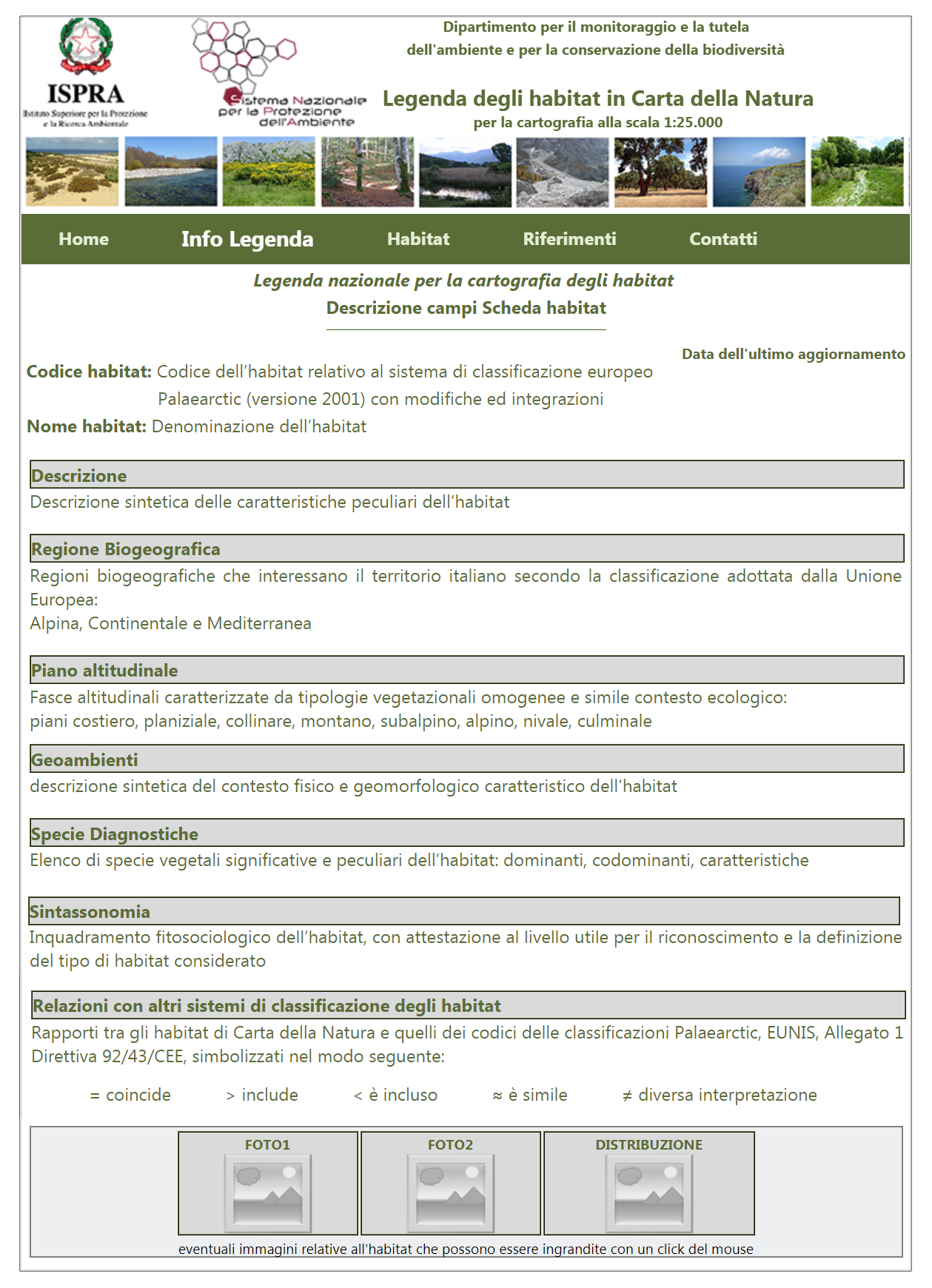 E’ stata predisposta una scheda descrittiva per ciascuno degli habitat inseriti in Legenda, in cui sono presenti campi relativi a: descrizione, regione biogeografica, piano altitudinale, geoambiente, specie vegetali diagnostiche, sintassonomia, relazioni con altri sistemi europei di nomenclatura degli habitat, distribuzione in Italia.