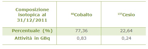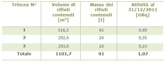 Dati relativi alla radioattività presente nelle trincee, come riportato nell’Inventario annuale 2011 sulla radioattività stoccata sull’impianto, trasmesso alle Autorità di Controllo: