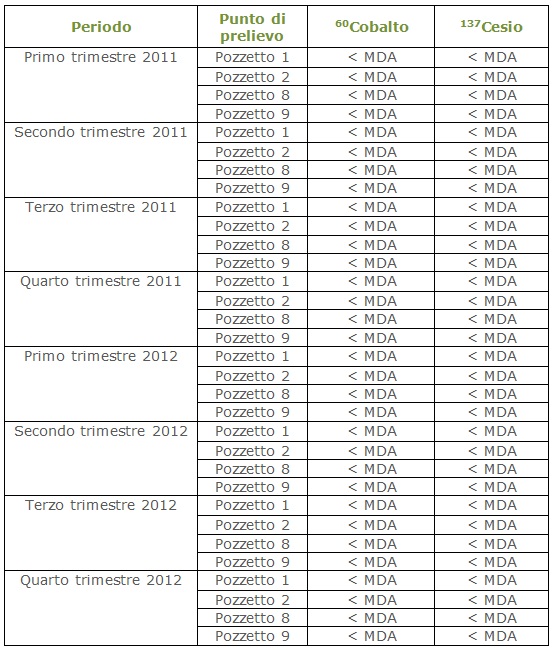 (MDA - Minimum Detectable Activity, rappresenta il valore più basso che uno strumento di misura riesce ad apprezzare. La strumentazione utilizzata presso i laboratori del Garigliano è la migliore commercialmente disponibile, con MDA 60Co 9,9 x 10-2 Bq/l ed MDA 137Cs 1,2 x 10-1 Bq/l)