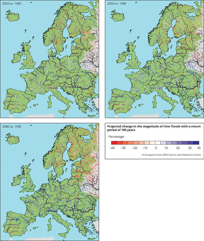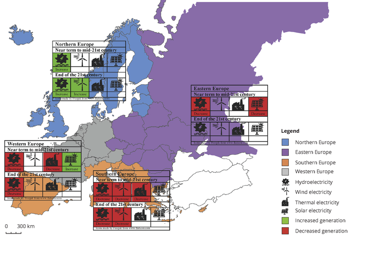 This map shows the projected impacts of climate change on electricity production from four different sources in four European regions. Green denotes positive impacts whereas red denotes negative impacts.