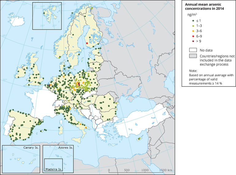 The map shows the arsenic annual mean concentrations. The red and dark red dots indicate stations with exceedances of the annual target value (6 ng/m3). Only stations with more than 14 % of valid data have been included in the map.