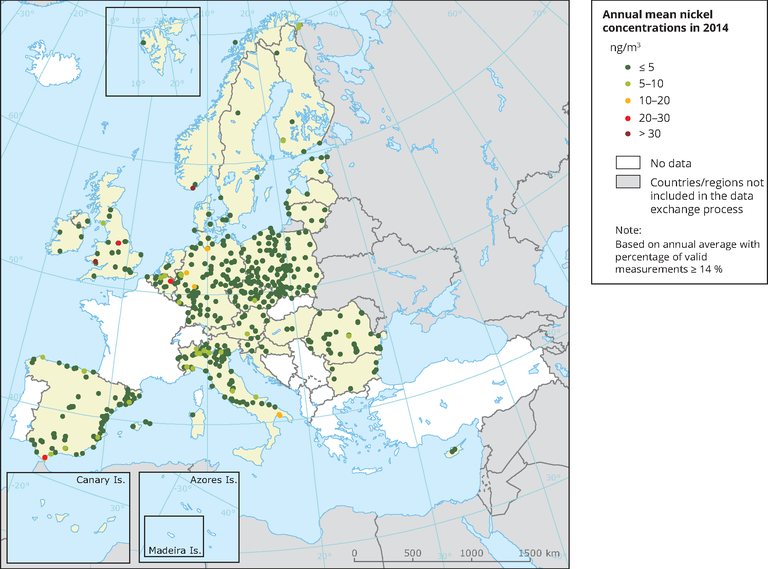 The map shows the Ni annual mean concentrations. The red and dark-red dots indicate stations with concentrations exceeding the target value (20 ng/m3). Only stations with more than 14 % of valid data have been included in the map