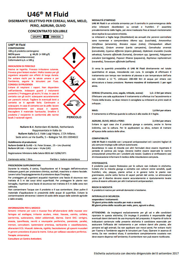 Esempio Etichetta autorizzata con decreto dirigenziale del 8 settembre 2017- fonte banca dati dei prodotti fitosanitari Ministero della Salute -: