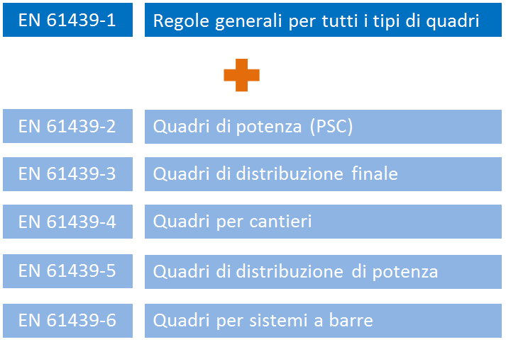 Questo significa che per la rispondenza alle norme di un quadro elettrico occorreranno almeno due norme: la CEI EN 61439-1 più quella specifica alla tipologia del quadro elettrico da realizzare, ad esempio CEI EN 61439-2 per i quadri di potenza.