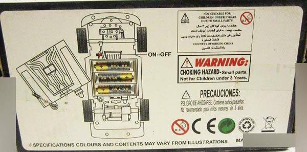 Alcune parti non accessibili del giocattolo (batterie, alcuni componenti elettronici) contengono piombo (valore misurato equivalente allo 0,358 % in peso) e cadmio (valore misurato equivalente 0,027 % in peso). Inoltre, la lampada LED ed alcuni componenti elettronici contengono bromo (valore misurato equivalente allo 0,30 % in peso), il diffusore audio contiene cromo (valore misurato equivalente allo 0,587 % in peso).