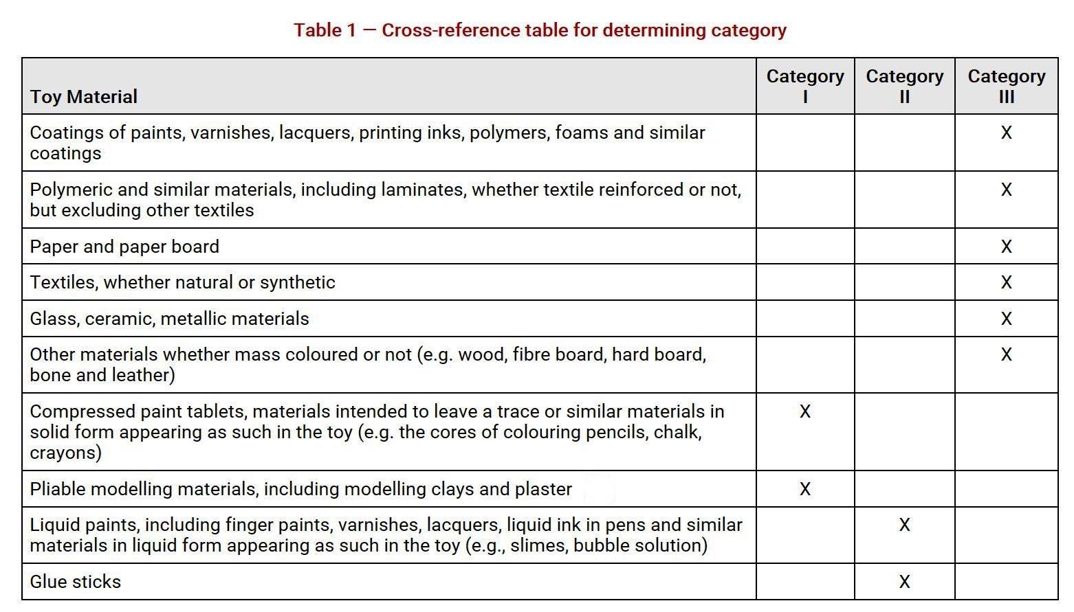La Tabella 1 della norma tecnica EN 71-3 permette di determinare la categoria del materiale utilizzato, mentre la Tabella 2 riporta i limiti massimi di migrazione per tipologia di elemento.