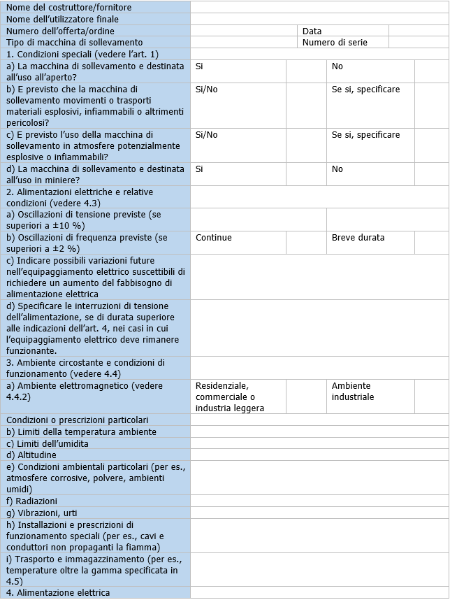 Questo facilita l’accordo tra utilizzatore e fornitore sulle condizioni di base e le esigenze supplementari dell’utilizzatore per consentire una progettazione, un’applicazione e un utilizzo corretti dell’equipaggiamento elettrico della macchina di sollevamento (vedere 4.1)."