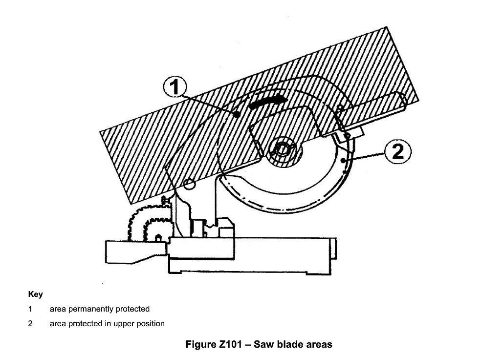 Per quanto riguarda, invece, la protezione della lama, la norma ne specifica le caratteristiche al punto 18.1.101. Indicando che l’area 1 (Fig. Z101) deve essere munita di un riparo fisso che copra le zone periferiche ed entrambi i lati della lama fino ai denti della stessa, indipendentemente dalla posizione in cui si trova l’unità di taglio.