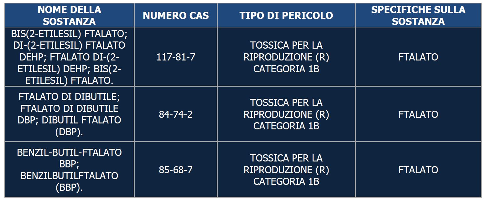 I ftalati DEHP, DBP, BBP sono proibiti in tutti i giocattoli ed articoli per bambini.