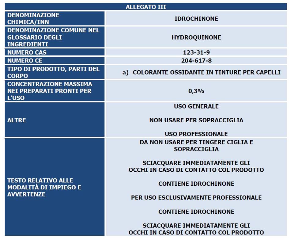 L’Idrochinone è una sostanza soggetta a restrizioni, per l’uso previsto dalla tabella presente all'All.III del Reg. 1223/2009, ed è vietato in tutti gli altri casi all’interno di prodotti cosmetici.
