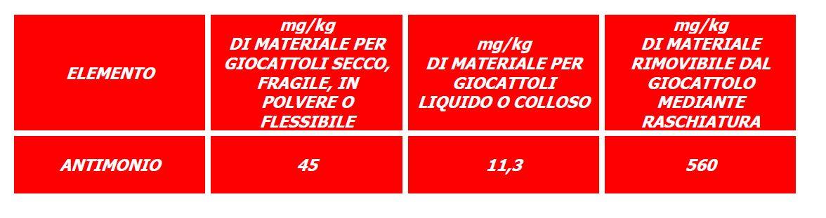 Fatti salvi i punti 3, 4 e 5, non devono essere superati i seguenti limiti di migrazione degli elementi sotto indicati dai giocattoli o dai loro componenti.