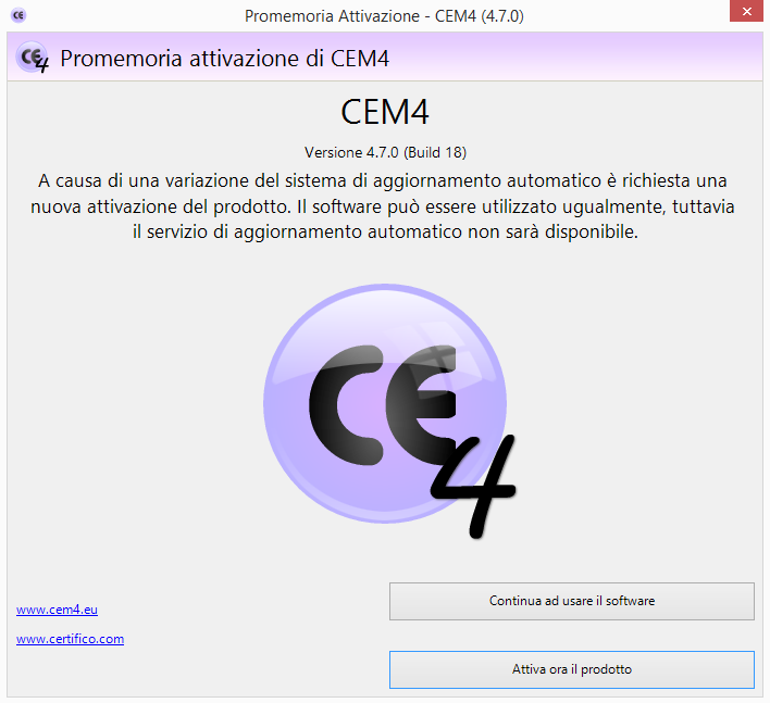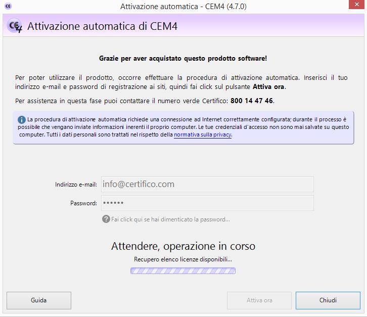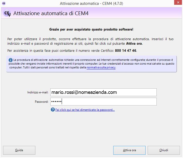 dalla Versione 4.7.0 di Certifico Macchine 4 (04 Marzo 2015) è stata introdotta la procedura di attivazione automatica(*) del software(**).