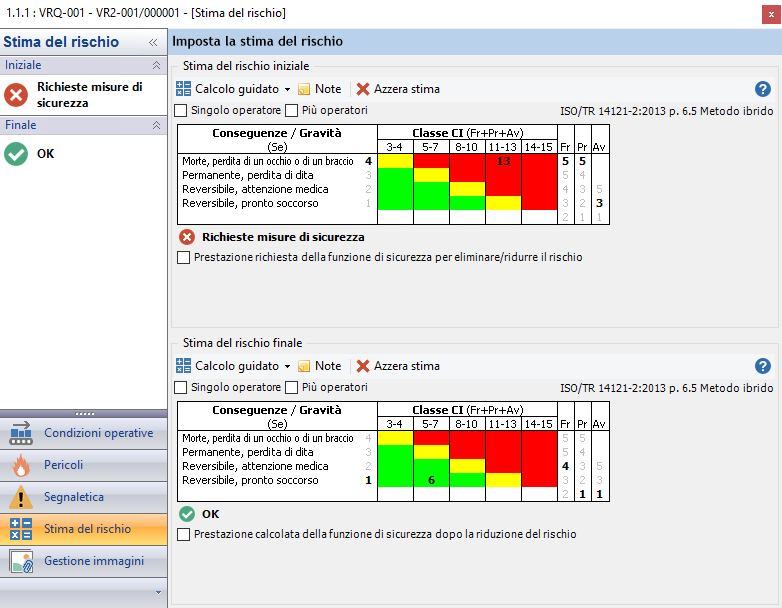 Dalla versione CEM4 Rel. 4.8.9 di Ottobre 2017 è modificato il Report di Valutazione del rischio RESS/Pericoli per l’inserimento del valore numerico/grafico della riduzione del rischio in riferimento alle matrici di stima del metodo ibrido ISO/TR 14121-2:2012 p. 6.5 (Fig. 1) confrontato tra la stima del rischio iniziale e finale/residuo (Fig. 2).