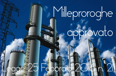 Sulla Gazzetta ufficiale n. 47 del 26 febbraio 2016 pubblicata la Legge di Conversione n. 21/2016, del Decreto Milleproroghe 2016 con le modifiche apportate (Vedi allegato).