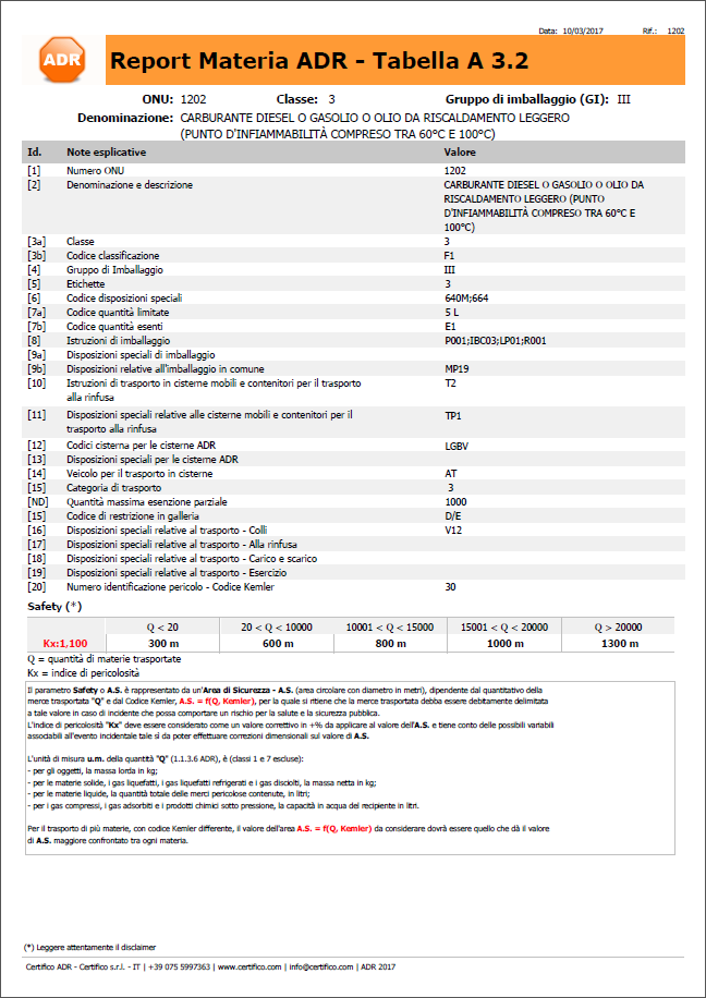 Per il trasporto di più materie, con codice Kemler differente, il valore dell'area A.S. = f(Q, Kemler) da considerare dovrà essere quello che dà il valore di A.S. maggiore confrontato tra ogni materia