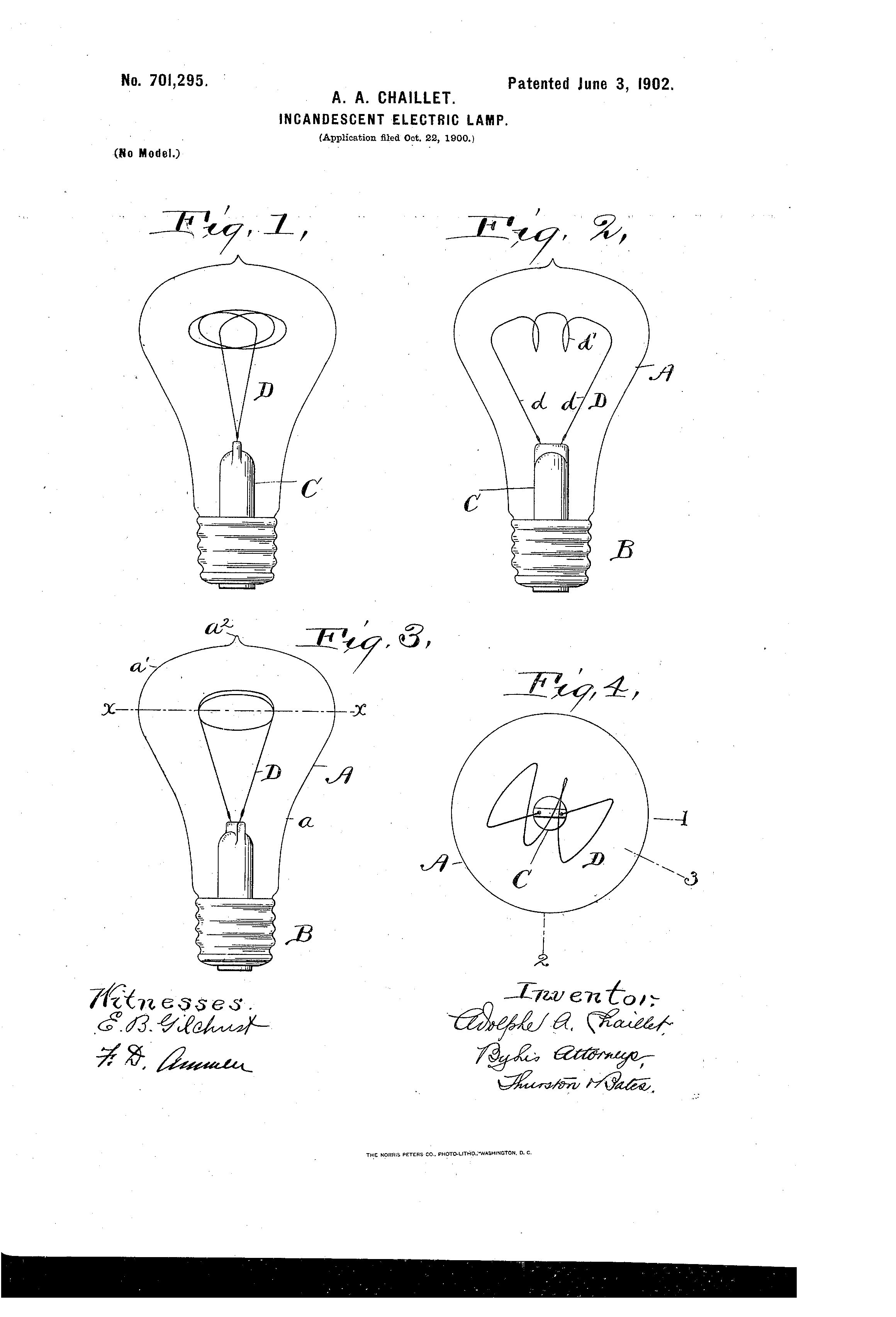 Il globo è di forma piriforme o di pera generale, ma appiattito alla sua estremità a punta, in modo da essere sostanzialmente parallelo alle linee inferiori dei filamenti quando la lampada è sospesa dall'alto. Ciò impedisce la rifrazione dei raggi, permettendo loro di passare attraverso il vetro perpendicolarmente. I disegni illustrano chiaramente la mia invenzione.