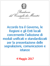 Pubblicato sulla Gazzetta Ufficiale Serie Generale n. 128 del 5 giugno 2017 - Supplemento Ordinario n. 26 l'Accordo del 4 maggio 2017 tra il Governo, le Regioni e gli Enti locali concernente l'adozione di moduli unificati e standardizzati per la presentazione delle segnalazioni, comunicazioni e istanze nei settori dell'edilizia e delle attività commerciali e assimilabili.