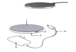 | Un dispositivo (cosiddetta «piastra di ricarica senza fili») composto da un adattatore con un cavo della lunghezza di circa 180 cm e da una piastra di ricarica. Il cavo dispone di un connettore per il collegamento alla piastra di ricarica. La piastra è di forma circolare con un'altezza di circa 8 mm, un diametro di circa 80 mm e un peso di 51 g. L'adattatore converte (rettifica) la corrente alternata (AC — 240V) in corrente continua (DC — 12V) e la trasferisce alla piastra. Nella piastra la DC è convertita (invertita) in AC che è a sua volta convertita in un campo elettromagnetico. Il dispositivo è destinato a ricaricare apparecchiature mediante connessione senza fili. Tanto la piastra quanto l'apparecchiatura ricaricata sono dotate di tecnologia «Qi», lo standard per la ricarica senza fili di apparecchiature. La ricarica senza fili è effettuata mediante un campo elettromagnetico. Cfr. l'immagine (*1) |