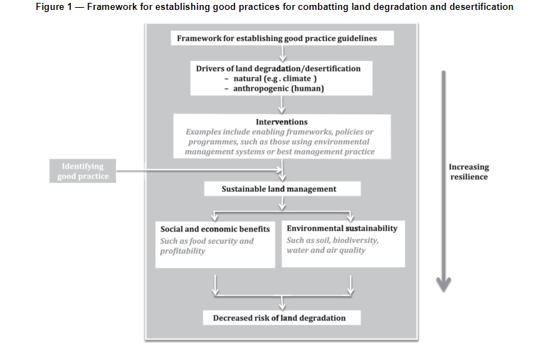 Riconoscendo il significato del degrado della terra che ha portato alla desertificazione nelle zone di sabbia, la Convenzione delle Nazioni Unite per combattere la desertificazione (UNCCD) è stato sviluppato per combattere la desertificazione e mitigare gli effetti della siccità nelle regioni del dryland, in particolare nell'Africa sub-sahariana. L'UNCCD riconosce la desertificazione come questione sociale ed economica tanto quanto una preoccupazione ambientale. Pertanto, si concentra soprattutto sulla lotta contro la povertà e promuove lo sviluppo sostenibile in aree a rischio di desertificazione. Le parti dell'UNCCD hanno accettato di attuare programmi d'azione nazionali, regionali e subregionali e cercare di affrontare le cause del degrado del suolo, come la gestione insostenibile del suolo. Il presente documento intende integrare e sostenere le attività dell'UNCCD fornendo orientamenti ai gestori dei terreni per stabilire buone pratiche di gestione che, ridurrà il rischio di degrado della terra e della desertificazione e contribuirà alla riabilitazione delle terre colpite dal degrado. I gestori della terra che si aspettano di trarre beneficio dalla norma includono gli utenti della terra, gli esperti tecnici, le organizzazioni private e pubbliche e i responsabili politici coinvolti nella gestione delle risorse terrestri per obiettivi ecologici, produttivi, economici o sociali.