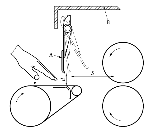 a) Il dispositivo è utilizzato per arrestare le parti pericolose del macchinario lontane dal sensore. In questa applicazione, la distanza tra il sensore e le parti mobili della macchina deve essere tale che la macchina si fermi prima che qualsiasi parte del corpo possa raggiungere la zona pericolosa. La distanza deve essere calcolata sulla base dei principi della ISO 13855.
