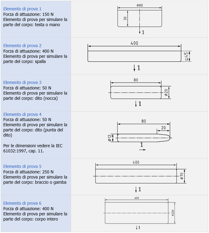 Tabella 1 – Elemento di prova, forze di azionamento e direzioni di prova