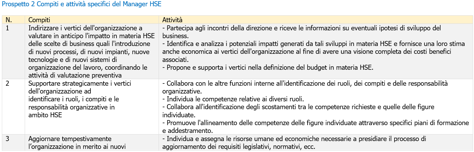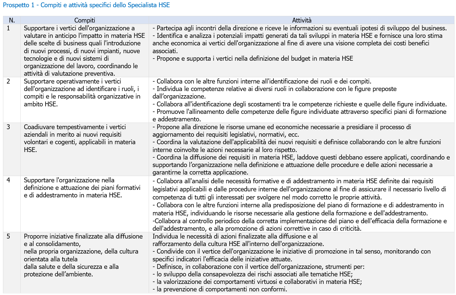 Sebbene l’articolazione ultima dei compiti e delle relative attività alle quali questa figura professionale fa fronte dipenda dalle caratteristiche dell'organizzazione nella quale si trova ad operare (che possono variare in termini di settore di appartenenza, di processi, di dimensione territoriale, di numero di sedi od unità locali in Italia e/o all’estero, di dimensioni per fatturato o forza lavoro e di risorse economiche disponibili), è possibile definire un elenco di compiti e attività fondamentali che qualificano questa figura professionale e che sono dei descrittori oggettivi dei ruoli del Professionista HSE.