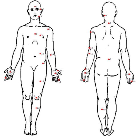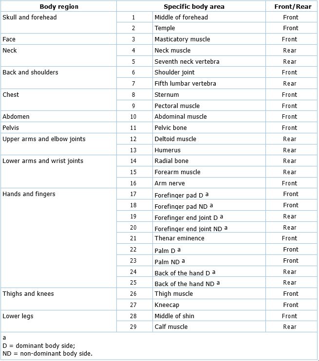 La Figura 1 mostra le 29 aree di contatto del corpo, mentre Tabella A.1 mostra le 12 regioni specifiche del corpo, classificate in regioni generali del corpo, parte anteriore o posteriore del corpo in relazione alle stesse.