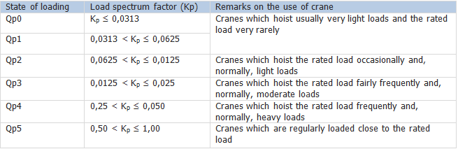 2) Il regime di carico, ovvero lo stato di sollecitazione dell’apparecchio in base al tipo di carico. Esso è riferito al numero di volte che un carico di una certa grandezza è sollevato, in rapporto alla portata nominale dell'apparecchio di sollevamento. Condizione di impiego e regime di carico determinano il fattore di spettro del carico (Kp) dell'apparecchio nel complesso, che può essere calcolato come segue: