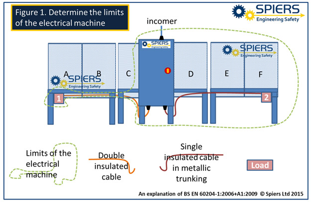 Let us now consider load 2: this time the motor is supplied by a cable with only basic insulation routed through metal trunking and attached to the guards of sections C to F. This time the motor and the guards would be considered as exposed conductive parts, as a fault in the basic insulation of the supply cable along its length up to the motor or a fault in the motor windings would result in the motor/guards becoming live. Protective conductors from the MET (PE terminal) to the motor and the guards would be selected, taking account of the protective device used to ensure automatic disconnection of the supply within a sufficiently short time to limit the duration of a touch voltage to a time within which the touch voltage is not hazardous.
