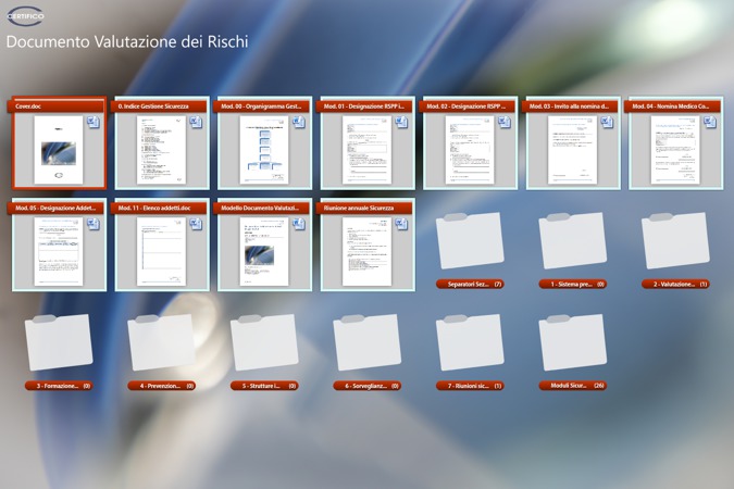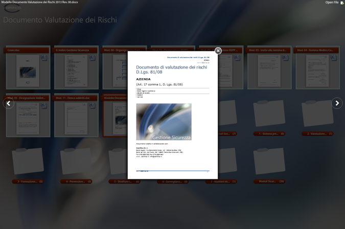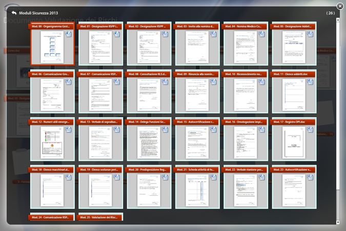 Il prodotto è organizzato in formato “Gestione Sicurezza”, con modello di DVR, Indice, Separatori di sezione, Modulistica nomine, Modello riunione annuale, ecc.