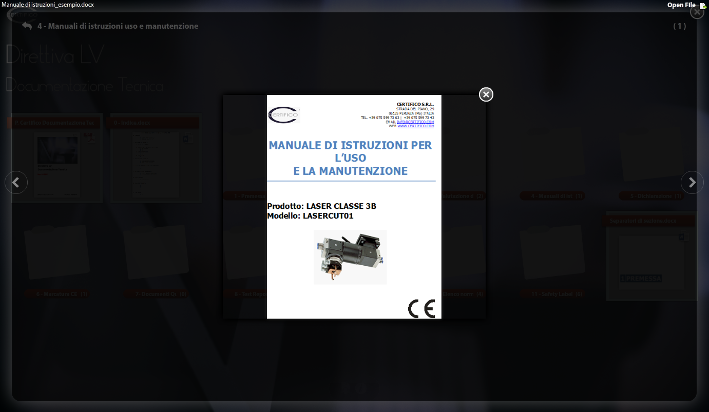 Il Prodotto è strutturato come master per la marcatura CE di materiale elettrico rientrante nel campo di applicazione della Direttiva ed ha, per applicazione reale, documentazione esempio per un Prodotto lasercut, componente destinato ai costruttori di macchine per l’installazione in sistemi di taglio laser.