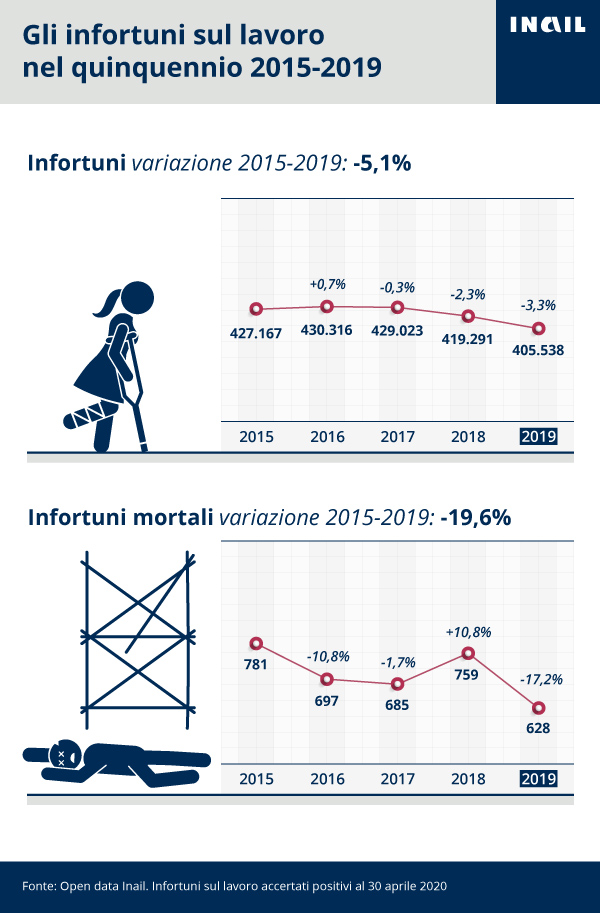 Gli infortuni sul lavoro denunciati all’Istituto nel 2019 sono stati 644.803, un numero sostanzialmente stabile rispetto al 2018 (-0,09%). Gli infortuni riconosciuti “sul lavoro” sono 405.538, di cui circa il 18,6% avvenuti “fuori dell’azienda” (cioè in occasione di lavoro “con mezzo di trasporto” e “in itinere”, nel percorso di andata e ritorno tra la casa e il luogo di lavoro).