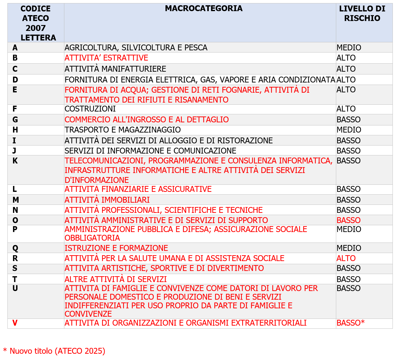 Codice ATECO e Livello di Rischio / Update Rev. 3.0 Maggio 2025 (ATECO 2025)