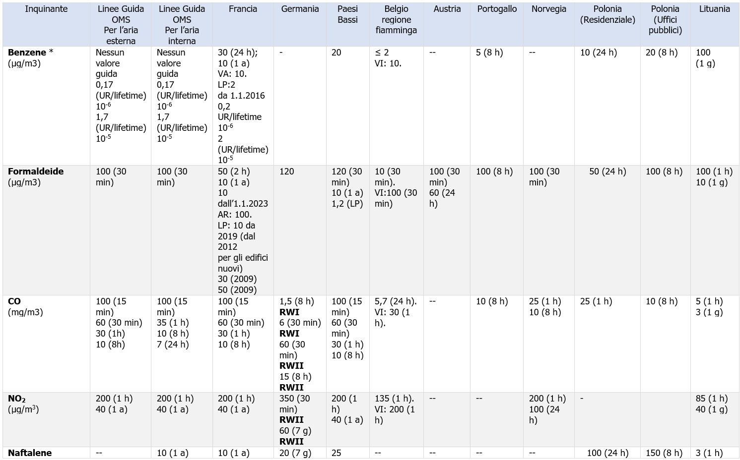 Inquinanti dell'aria indoor: valori guida di qualità dell'aria di alcuni Paesi europei e rischio unitario (Unit Risk, UR) relativi ad alcuni inquinanti
