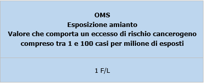 Le linee guida dell’OMS per la qualità dell'aria in Europa (Publications, European Series, N.91 WHO 2000) evidenziano che un'esposizione continuativa per l'intera vita della popolazione generale a 1 F/L (0,001 F/cm3) di amianto, misurata mediante microscopia elettronica a scansione (SEM), comporta un eccesso di rischio cancerogeno compreso tra 1 e 100 casi per milione di esposti.