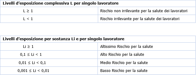 Per ogni sostanza chimica pericolosa sono prese in considerazione le caratteristiche di pericolosità intrinseca confrontate con gli interventi di prevenzione e protezione attuati e utili a mantenere sotto controllo il rischio connesso; la procedura va poi ripetuta per tutte le sostanze adoperate dallo stesso lavoratore nella settimana di riferimento, così da poter ricavare un valore somma indicativo (livello L d’esposizione complessivo) che tenga conto di tutti gli agenti utilizzati nel periodo.