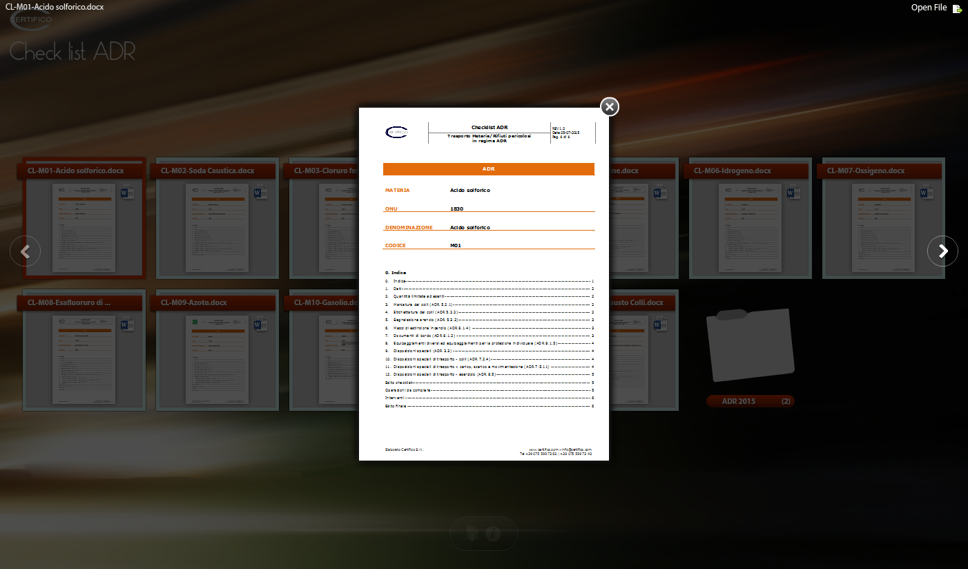 Il Prodotto presenta delle check list di controllo precompilate, fomato doc, per la gestione del carico/trasporto/scarico di materie ADR e rifiuti associati ADR.