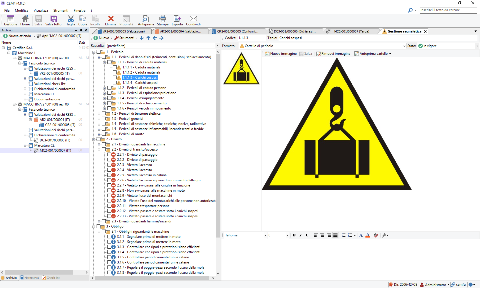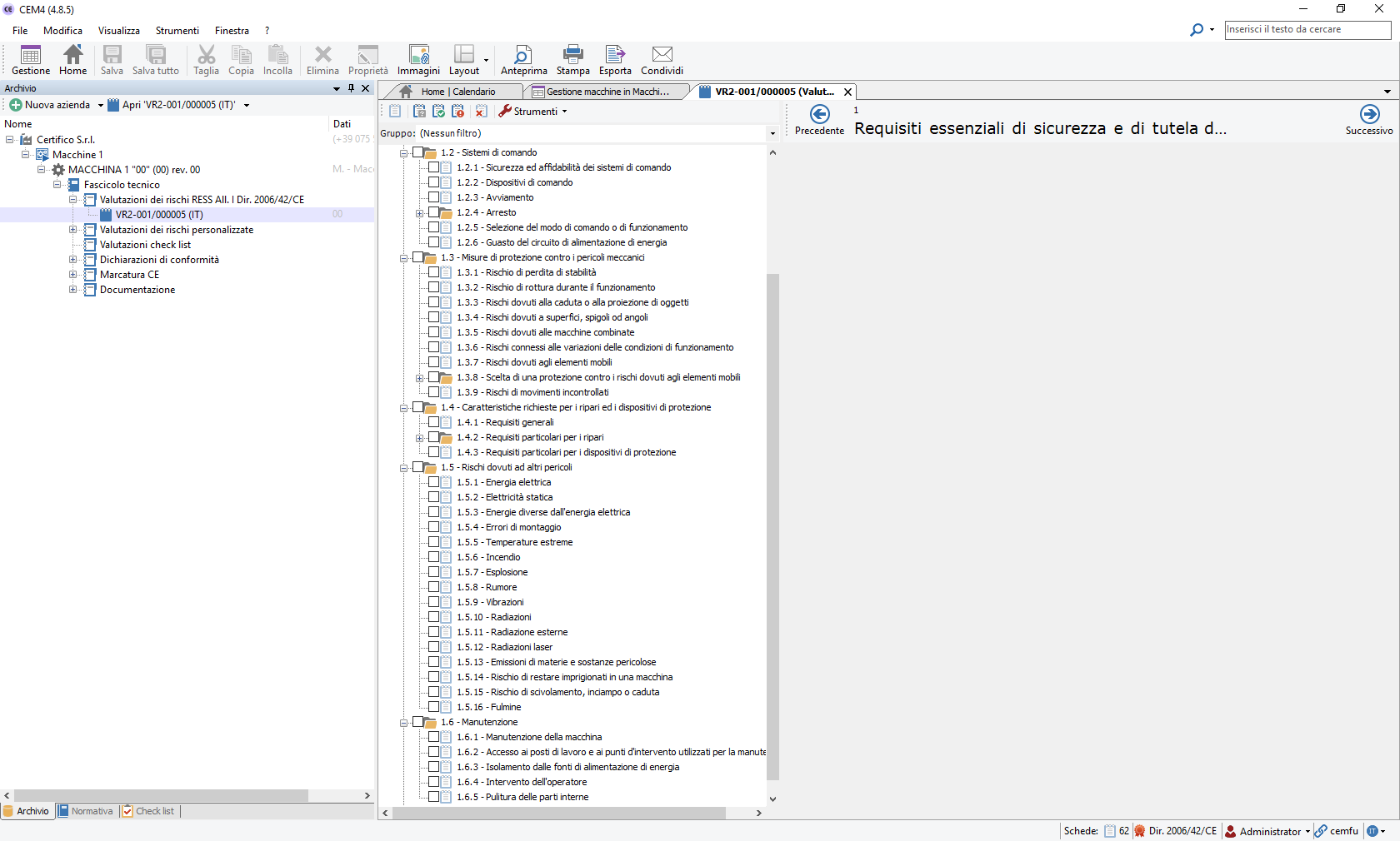 CEM4 consente di ottemperare a tutti gli obblighi imposti dalla Direttiva Macchine per il processo di marcatura CE in particolare: