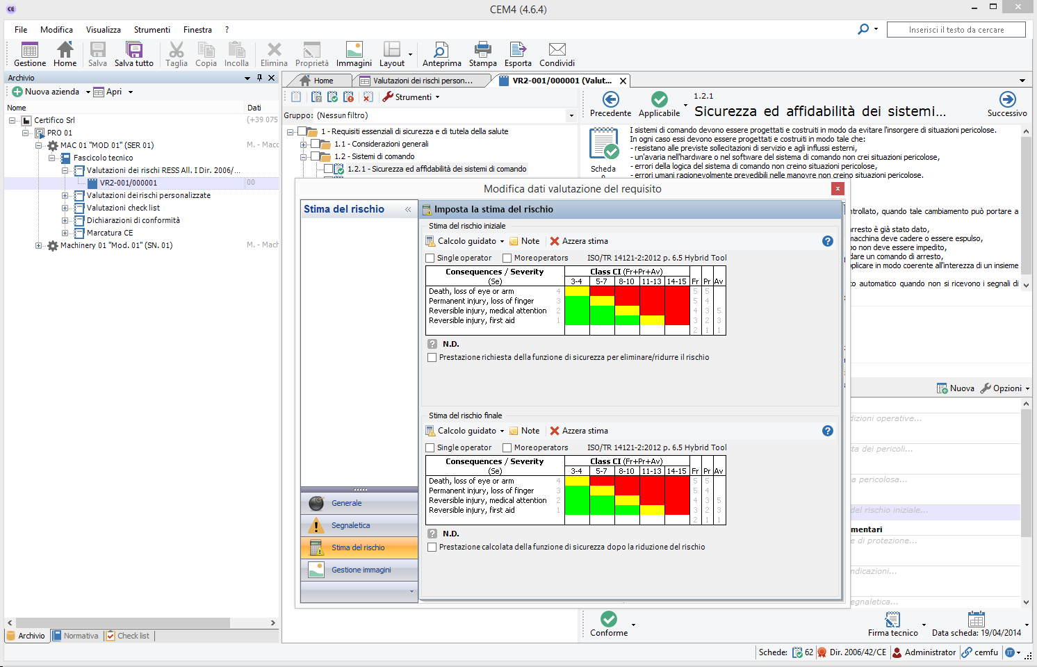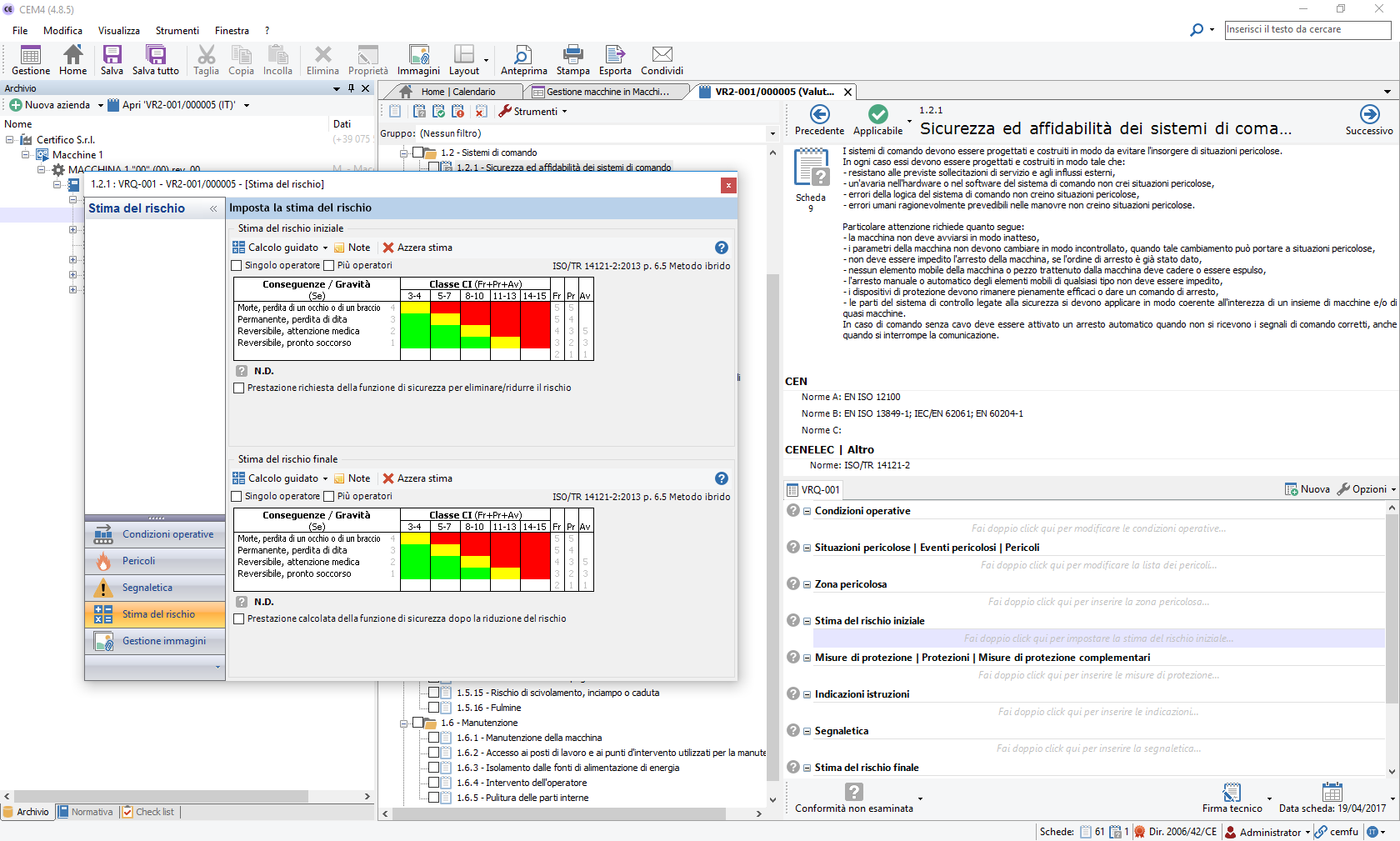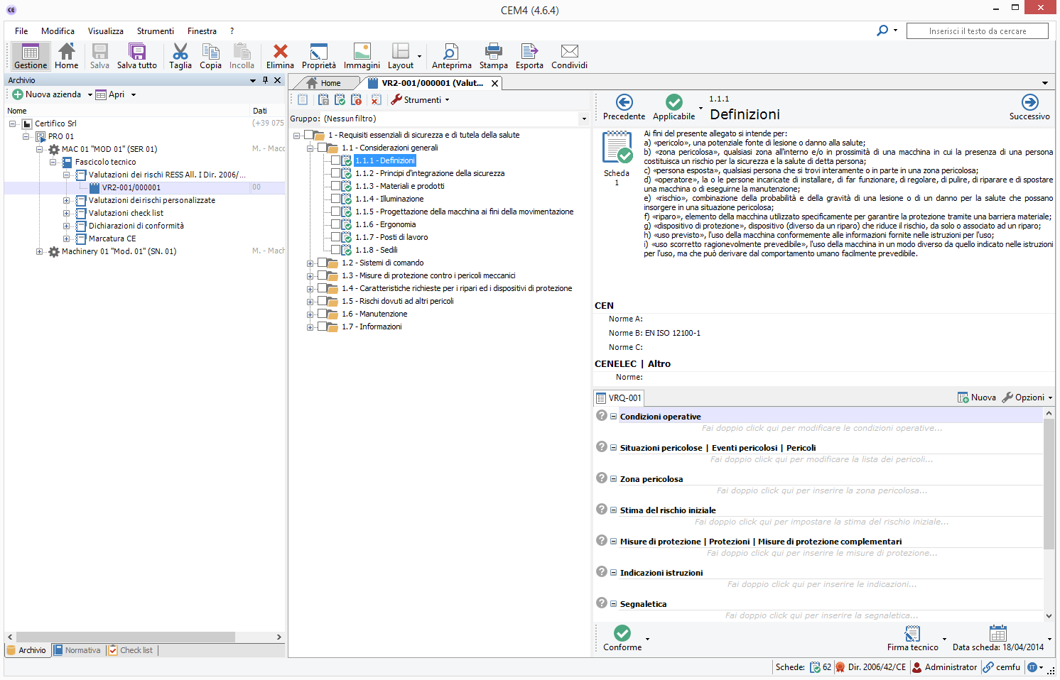 CEM4 consente di gestire il processo di marcatura CE di macchine in modo semplice e rigoroso: infatti è possibile ottemperare a tutti gli obblighi imposti dalla Direttiva Macchine, conformità ai RESS - Presunzione di Conformità, attraverso l'applicazione delle norme armonizzate .