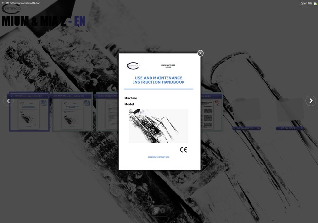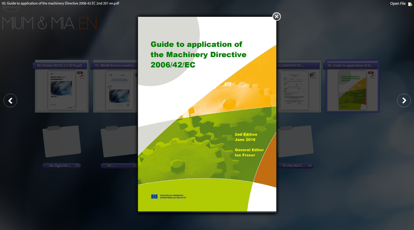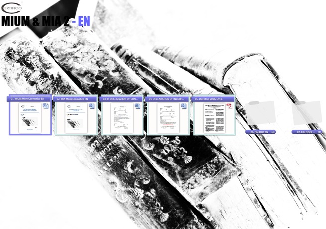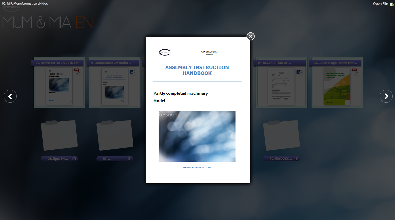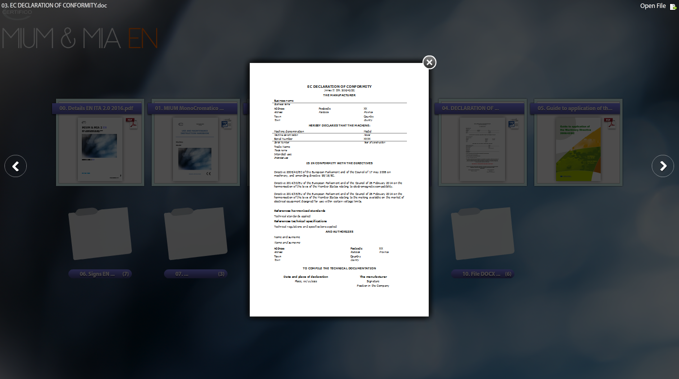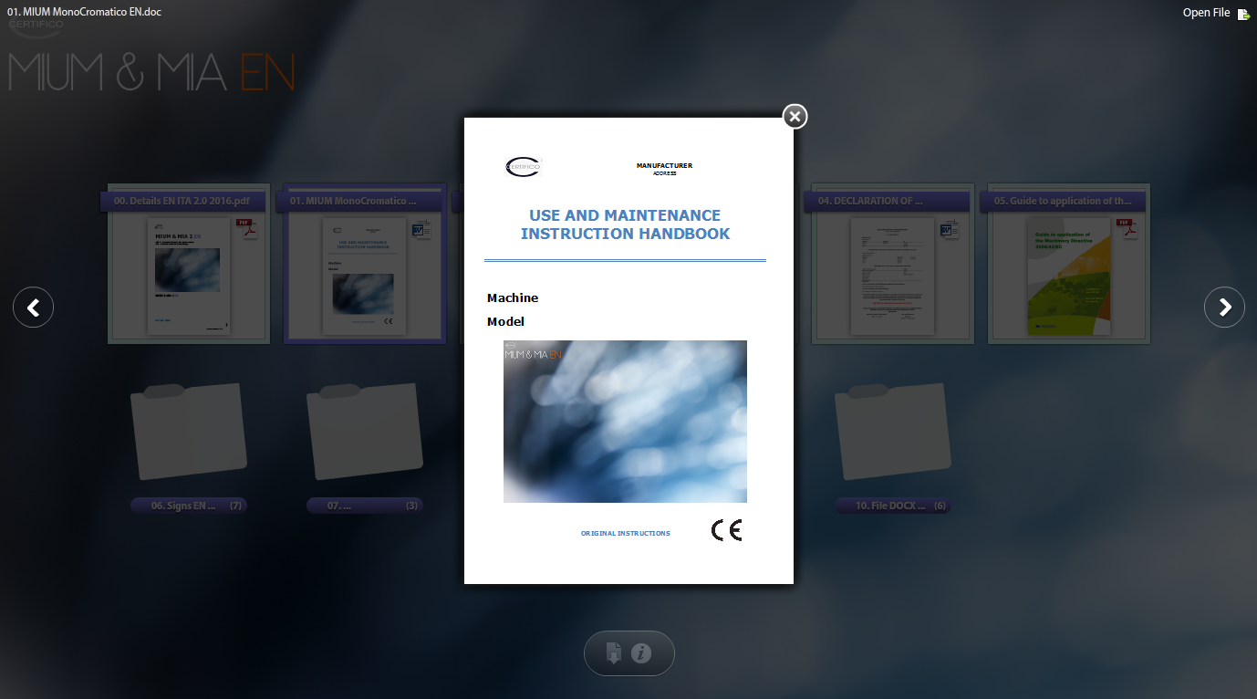 Certifico M.I.U.M. & M.I.A. Suite EN, completamente rinnovato nei contenuti e nella forma è un prodotto software/linea guida per la redazione del Manuale di Istruzioni per l'Uso e la Manutenzione di macchine e per la redazione del Manuale di Istruzioni di Assemblaggio di quasi-macchine, in lingua Inglese.