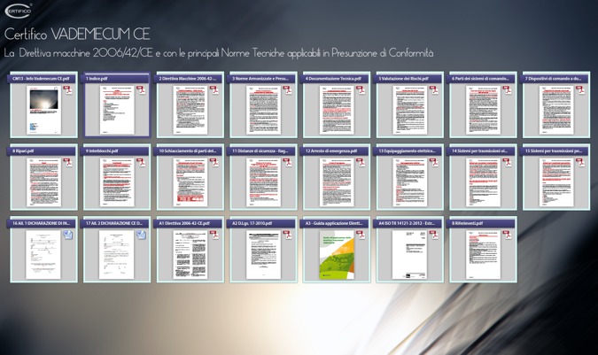 Certifico Vademecum CE è una Guida Tecnica che raccoglie, in formato facilmente consultabile e stampabile, informazioni complete per la progettazione sicura di macchine in accordo con la Direttiva macchine 2006/42/CE ed il Regolamento macchine (UE) 2023/1230 e con le principali Norme Tecniche armonizzate ISO, EN, UNI e CEI applicabili nel concetto di "Presunzione di Conformità".