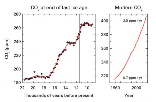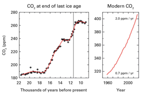 Il tasso di aumento del CO2 atmosferico negli ultimi 70 anni è quasi 100 volte più grande di quello alla fine dell'ultima era glaciale. Per quanto riguarda le osservazioni dirette , tali bruschi cambiamenti nei livelli atmosferici di CO2 non sono mai stati mai visti.
