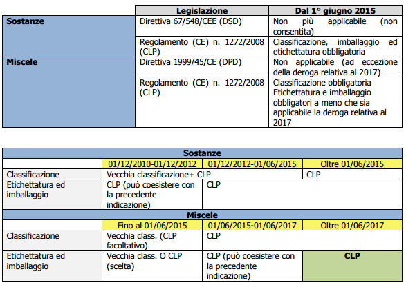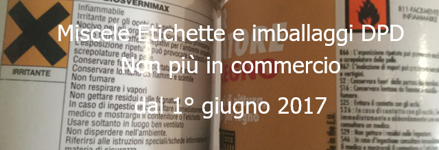 - le miscele con etichetta DPD (vecchia classificazione) non potranno essere commercializzate dai rivenditori oltre il 31 maggio 2017 se non previa di rietichettatura; fino a tale data sarà dunque possibile la presenza sul mercato di uno stesso prodotto con etichetta DPD e CLP;