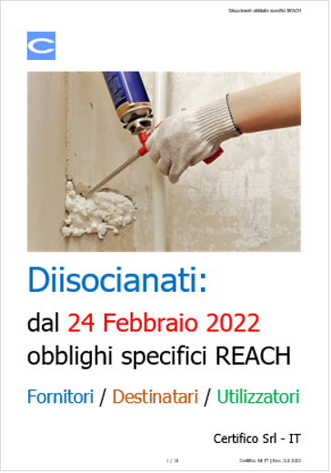 | 74. Diisocianati, O = C=N-R-N = C=O, in cui R è un’unità di idrocarburi alifatici o aromatici di lunghezza non specificata | 1. Da non utilizzare in quanto tali, come costituenti di altre sostanze o in miscele per usi industriali e professionali dopo il 24 agosto 2023, a meno che: a) la concentrazione di diisocianati, considerati singolarmente e in combinazione, sia inferiore allo 0,1 % in peso, o b) il datore di lavoro o il lavoratore autonomo garantisca che gli utilizzatori industriali o professionali abbiano completato con esito positivo una formazione sull’uso sicuro dei diisocianati prima di utilizzare le sostanze o le miscele. 2. Da non immettere sul mercato in quanto tali, come costituenti di altre sostanze o in miscele per usi industriali e professionali dopo il 24 febbraio 2022, a meno che: a) la concentrazione di diisocianati, considerati singolarmente e in una combinazione, sia inferiore allo 0,1 % in peso, o b) il fornitore garantisca che il destinatario delle sostanze o delle miscele disponga di informazioni sui requisiti di cui al paragrafo 1, lettera b), e che sull’imballaggio figuri la seguente dicitura, visibilmente separata dalle altre informazioni riportate sull’etichetta: «A partire dal 24 agosto 2023 l’uso industriale o professionale è consentito solo dopo aver ricevuto una formazione adeguata». 3. Ai fini della presente voce, per «utilizzatori industriali e professionali» si intendono i lavoratori e i lavoratori autonomi che manipolano diisocianati in quanto tali, come costituenti di altre sostanze o in miscele per usi industriali e professionali o sono incaricati della supervisione di tali compiti. 4. La formazione di cui al paragrafo 1, lettera b), comprende istruzioni per il controllo dell’esposizione ai diisocianati per via cutanea e per inalazione sul luogo di lavoro, fatti salvi gli eventuali valori limite nazionali di esposizione professionale o altre misure di gestione dei rischi adeguate a livello nazionale. Tale formazione deve essere condotta da un esperto in materia di salute e sicurezza sul lavoro, con competenze acquisite attraverso una pertinente formazione professionale. Tale formazione riguarda almeno: a) gli elementi di formazione di cui al paragrafo 5, lettera a), per tutti gli usi industriali e professionali; b) gli elementi di formazione di cui al paragrafo 5, lettere a) e b), per i seguenti usi: — manipolazione di miscele all’aperto a temperatura ambiente (compresi tunnel per la produzione di schiuma); — applicazione a spruzzo in cabina ventilata; — applicazione con rullo; — applicazione con pennello; — applicazione per immersione o colata; — trattamento meccanico successivo (ad esempio taglio) di articoli non completamente stagionati che non sono più caldi; — pulitura e rifiuti; — qualsiasi altro uso con un’esposizione simile per via cutanea e/o per inalazione; c) gli elementi di formazione di cui al paragrafo 5, lettere a), b) e c), per i seguenti usi: — manipolazione di articoli non completamente reagiti (ad esempio, appena reagiti, ancora caldi); — applicazioni per fonderie; — manutenzione e riparazioni per le quali è necessario accedere alle attrezzature; — manipolazione all’aperto di formulazioni calde o bollenti (> 45 °C); — applicazione a spruzzo all’aperto, con ventilazione limitata o esclusivamente naturale (anche in grandi capannoni industriali) e applicazione a spruzzo ad alta pressione (ad esempio schiume, elastomeri); — qualsiasi altro uso con un’esposizione simile per via cutanea e/o per inalazione. 5. Elementi di formazione: a) formazione generale, anche on line, riguardante: — chimica dei diisocianati; — pericoli di tossicità (compresa tossicità acuta); — esposizione ai diisocianati; — valori limite di esposizione professionale; — modalità di sviluppo della sensibilizzazione; — odore come segnale di pericolo; — importanza della volatilità per il rischio; — viscosità, temperatura e peso molecolare dei diisocianati; — igiene personale; — attrezzature di protezione individuale necessarie, comprese le istruzioni pratiche per il loro uso corretto e le loro limitazioni; — rischio di esposizione per contatto cutaneo e per inalazione; — rischio connesso al processo di applicazione utilizzato; — sistema di protezione della pelle e delle vie respiratorie; — ventilazione; — pulizia, fuoriuscite, manutenzione; — smaltimento di imballaggi vuoti; — protezione degli astanti; — individuazione delle fasi critiche di manipolazione; — sistemi di codici nazionali specifici (se pertinente); — sicurezza basata sui comportamenti (behaviour-based); — certificazione o prova documentale del completamento della formazione con esito positivo; b) formazione di livello intermedio, anche on line, riguardante: — ulteriori aspetti basati sui comportamenti (behaviour-based); — manutenzione; — gestione dei cambiamenti; — valutazione delle istruzioni di sicurezza esistenti; — rischio connesso al processo di applicazione utilizzato; — certificazione o prova documentale del completamento della formazione con esito positivo; c) formazione avanzata, anche on line, riguardante: — eventuali certificazioni ulteriori necessarie per gli usi specifici previsti; — applicazione a spruzzo al di fuori dell’apposita cabina; — manipolazione all’aperto di formulazioni calde o bollenti (> 45 °C); — certificazione o prova documentale del completamento della formazione con esito positivo. 6. La formazione deve essere conforme alle disposizioni stabilite dallo Stato membro in cui opera l’utilizzatore industriale o professionale. Gli Stati membri possono attuare o continuare ad applicare i loro requisiti nazionali per l’uso di tali sostanze e miscele, purché siano soddisfatti i requisiti minimi di cui ai paragrafi 4 e 5. 7. Il fornitore di cui al paragrafo 2, lettera b), deve garantire che il destinatario disponga dei materiali didattici e abbia ac