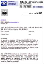 As agreed by resolution 179 taken by ISO/TC 199 "Safety of machinery" the enclosed table of correspondence between ISO 12100-1:2003, ISO 12100-2:2003, ISO 14121-1:2007 and the new ISO 12100:2010 "Safety of machinery - General principles for design - Risk assessment and risk reduction" published on 2010-11-01 is provided for the convenience of the users of these International Standards on behalf of ISO/TC 199.