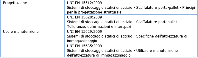 Le norme tecniche di riferimento per la progettazione/uso/manutenzione delle scaffalature metalliche sono in breve sintesi quelle dei “Sistemi di stoccaggio statici di acciaio”:
