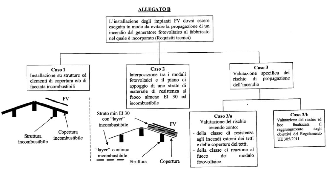 In via generale l'installazione di un impianto fotovoltaico (FV), in funzione delle caratteristiche elettriche/costruttive e/o delle relative modalità di posa in opera, può comportare un aggravio del preesistente livello di rischio di incendio.(1)
