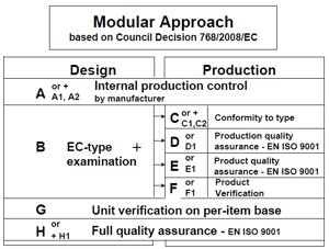 La normativa comunitaria di armonizzazione prescrive la valutazione della conformità per i prodotti, le procedure da utilizzare vanno scelte tra i moduli stabiliti e specificati nell'allegato II della Decisione 768/2008/CE, conformemente ai criteri seguenti: