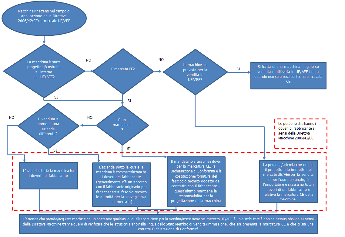 Ciò comporta che la persona che immette la macchina sul mercato debba essere in grado di assolvere a tali obblighi, che includono: accertarsi che la macchina soddisfi i pertinenti requisiti essenziali di sicurezza e di tutela della salute, assicurare la disponibilità del fascicolo tecnico, fornire le istruzioni per l’uso, effettuare la necessaria procedura di valutazione di conformità, redigere e firmare la dichiarazione CE di conformità della macchina, nonché apporre la marcatura CE.