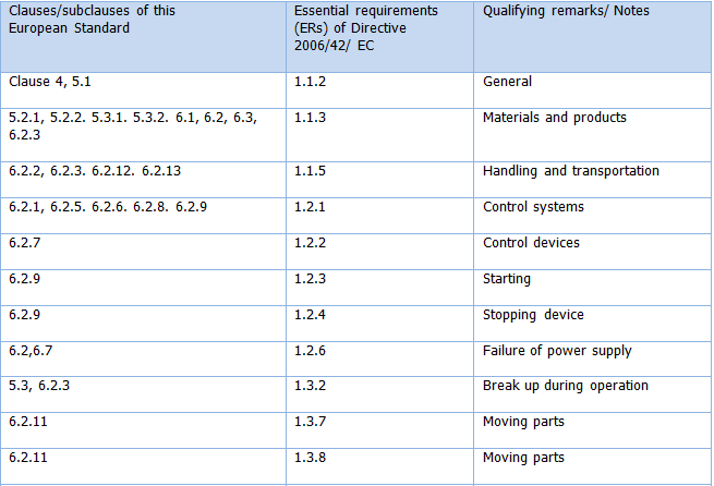 Questo standard europeo è stato preparato con un mandato conferito a CEN dalla Commissione europea e dall'Associazione europea di libero scambio per fornire un mezzo per conformarsi ai requisiti essenziali della direttiva 2006/42/CE del Parlamento europeo e del Consiglio del 17 maggio 2006 Macchine (rifusione).